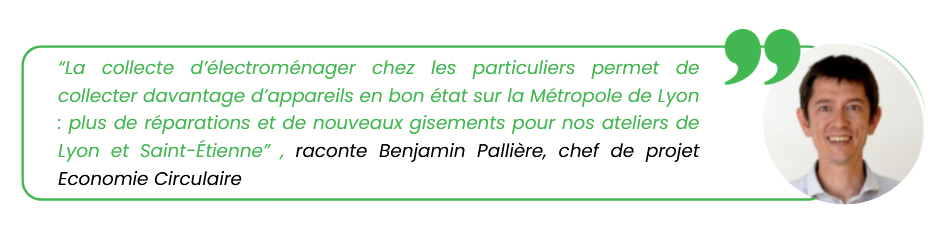 - JDME (Je Donne Mon électroménager) porté par ecosystem et la Métropole de Lyon, permet aux particuliers de faire enlever leur électroménager à domicile gratuitement et sur rendez-vous.
